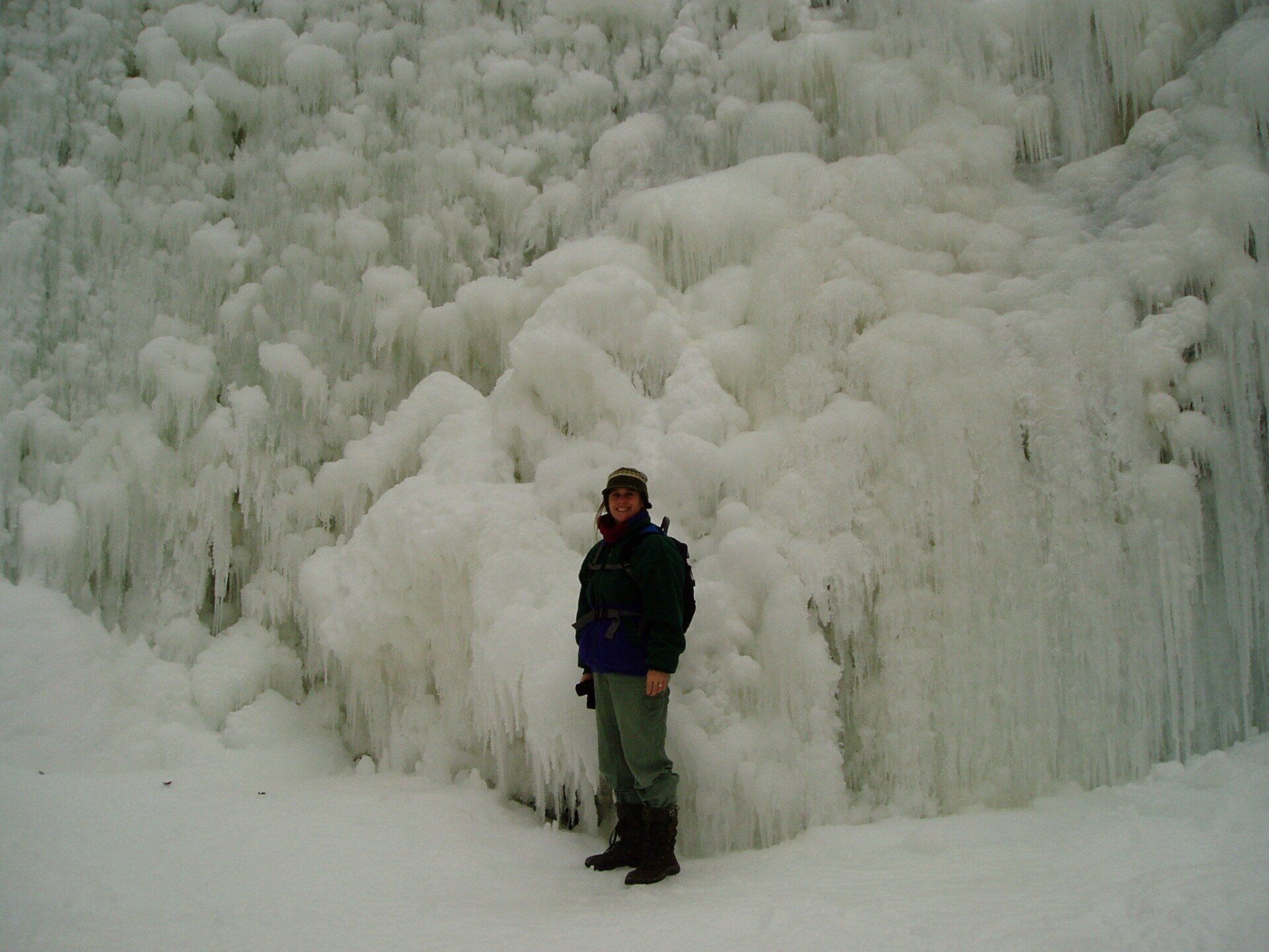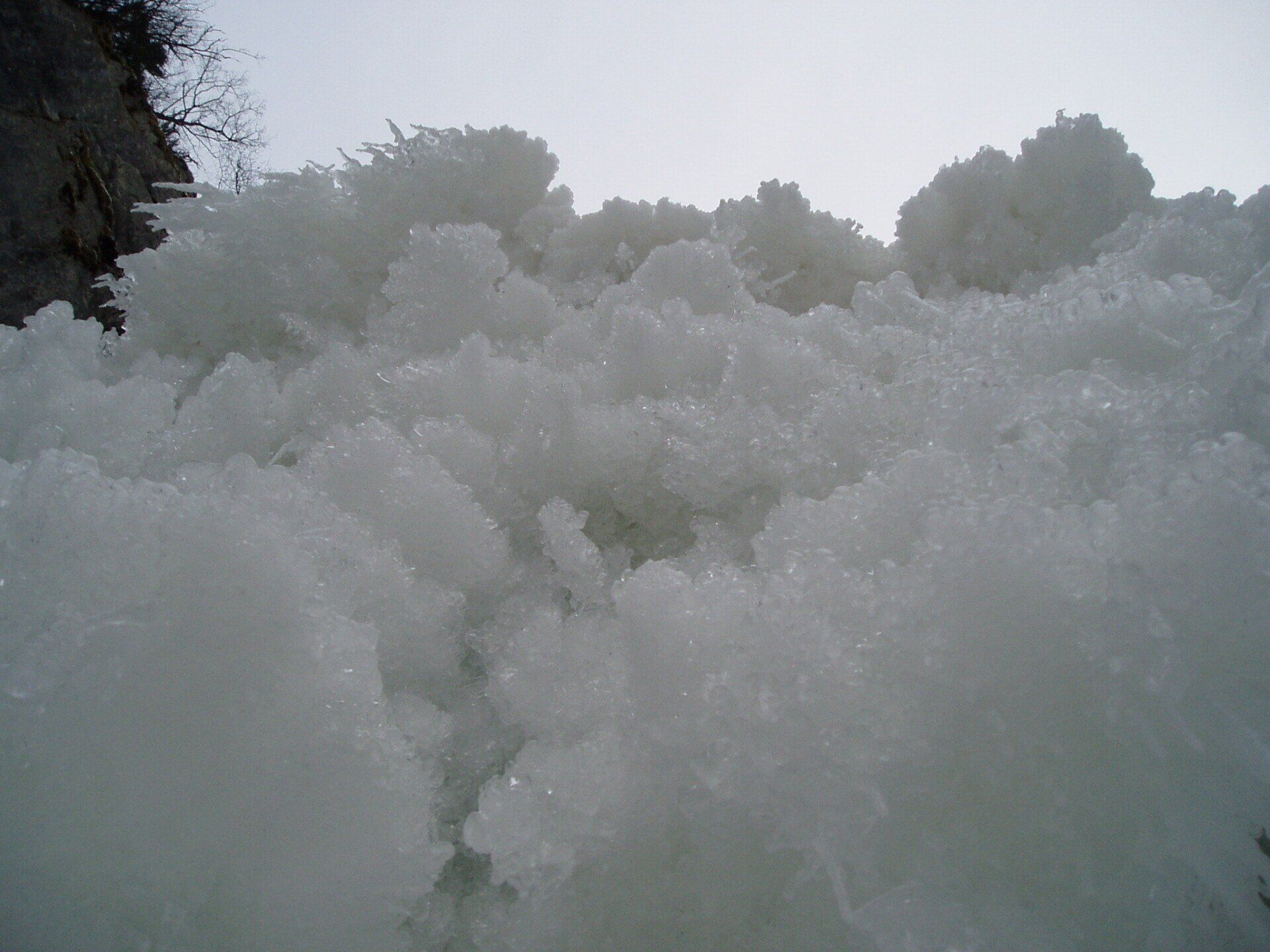 I stood at the base of the falls, standing on the normally deep pool and I looked up. Above me looked like an impenetrable forest of translucent fungi reaching every higher towards the sky, and at the top where the water normally cascades over the lip of rock, the ice resembled the curling foamy crest of an ocean wave.