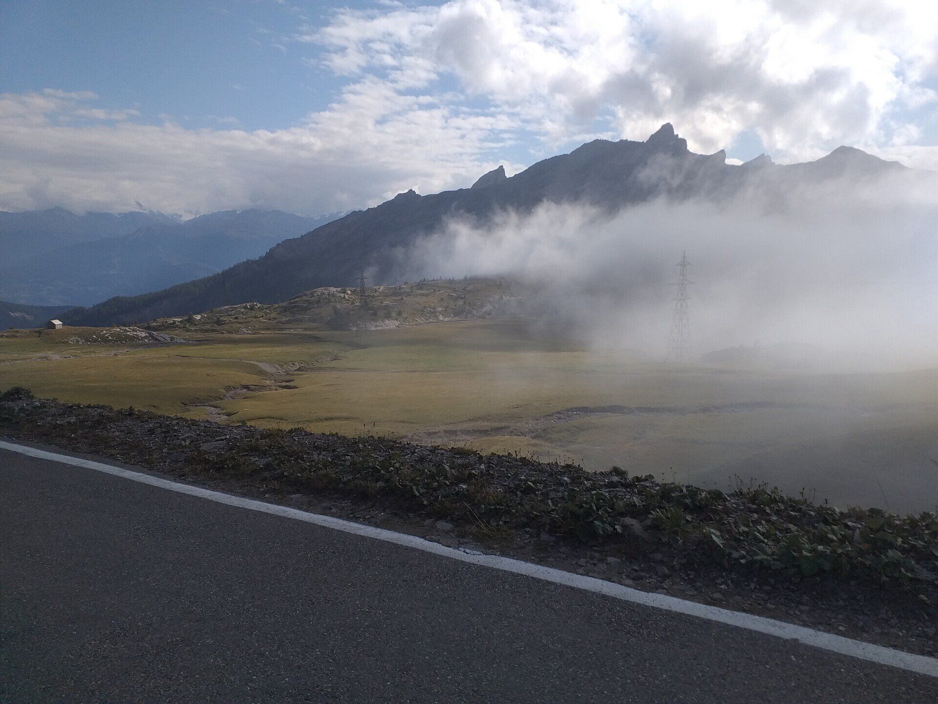 We cycle on up, trying to keep our focus on the road but spending most of the time gazing open-mouthed at the landscape and the vastness. The mist thickens, and the sun is unable to push through. I take off my sunglasses and put on thicker gloves as we cycle deeper into the freezing cloud.