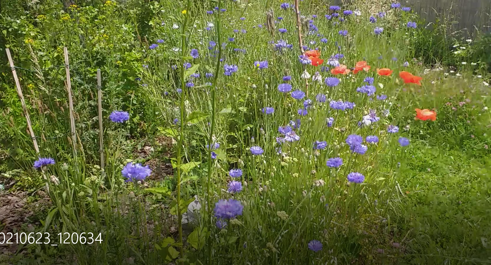 Some flowers this year are taller and brighter and earlier while others are later to flower. The wildflower patch was bare earth this time last year and this year is full of tall, bright-blue cornflowers and deep red poppies. It’s beautiful. The bottle wall garden has gone crazy this year, it’s bursting with plants, colour, and insects. And the two tiny vines we planted last year are growing stronger and larger by the day despite their tall neighbours.